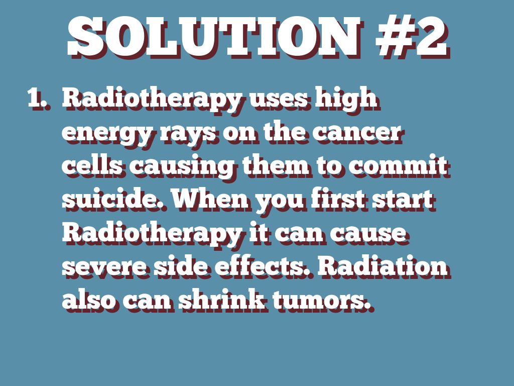 Radiotherapy uses high energy rays on the cancer cells causing them to commit suicide. When you first start Radiotherapy it can cause severe side effects. Radiation also can shrink tumors.