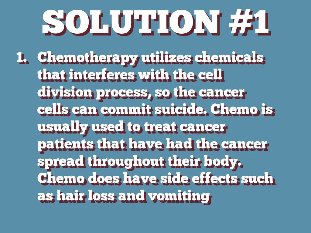 Chemotherapy utilizes chemicals that interferes with the cell division process, so the cancer cells can commit suicide. Chemo is usually used to treat cancer patients that have had the cancer spread throughout their body. Chemo does have side effects such as hair loss and vomiting