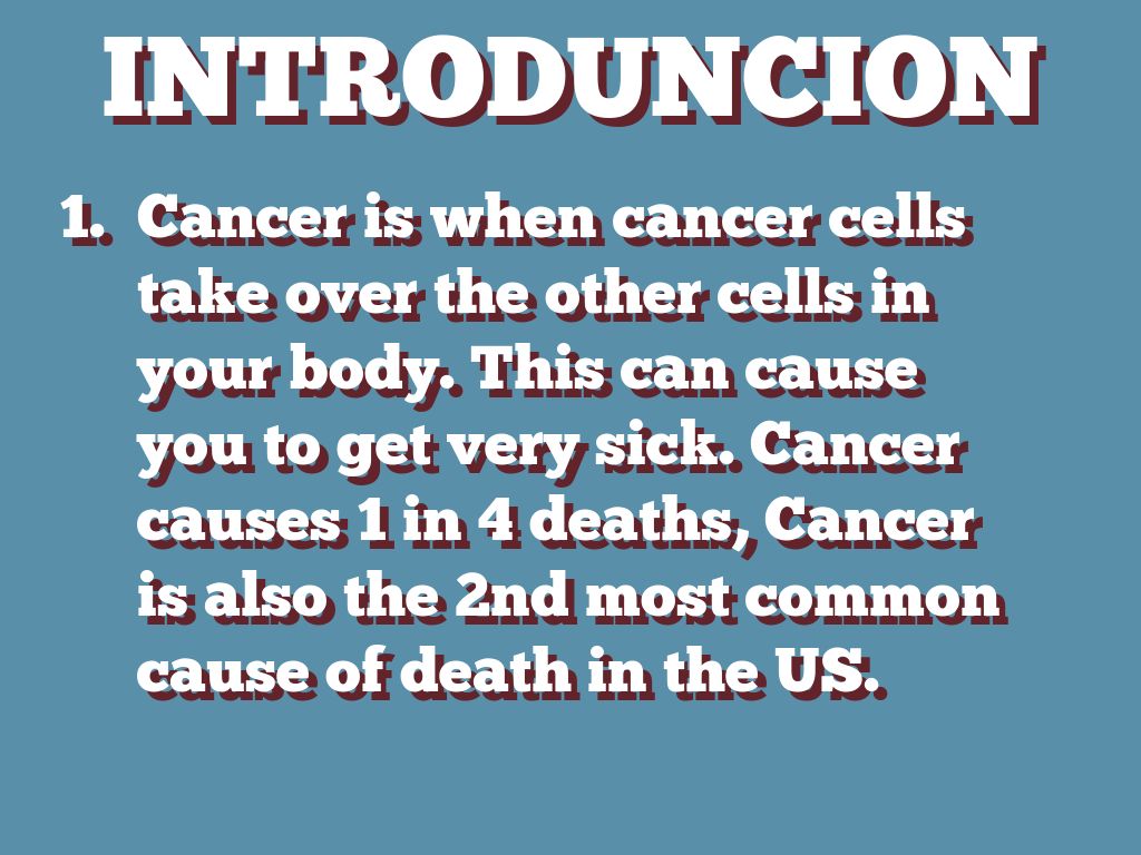Cancer is when cancer cells take over the other cells in your body. This can cause you to get very sick. Cancer causes 1 in 4 deaths, Cancer is also the 2nd most common cause of death in the US.