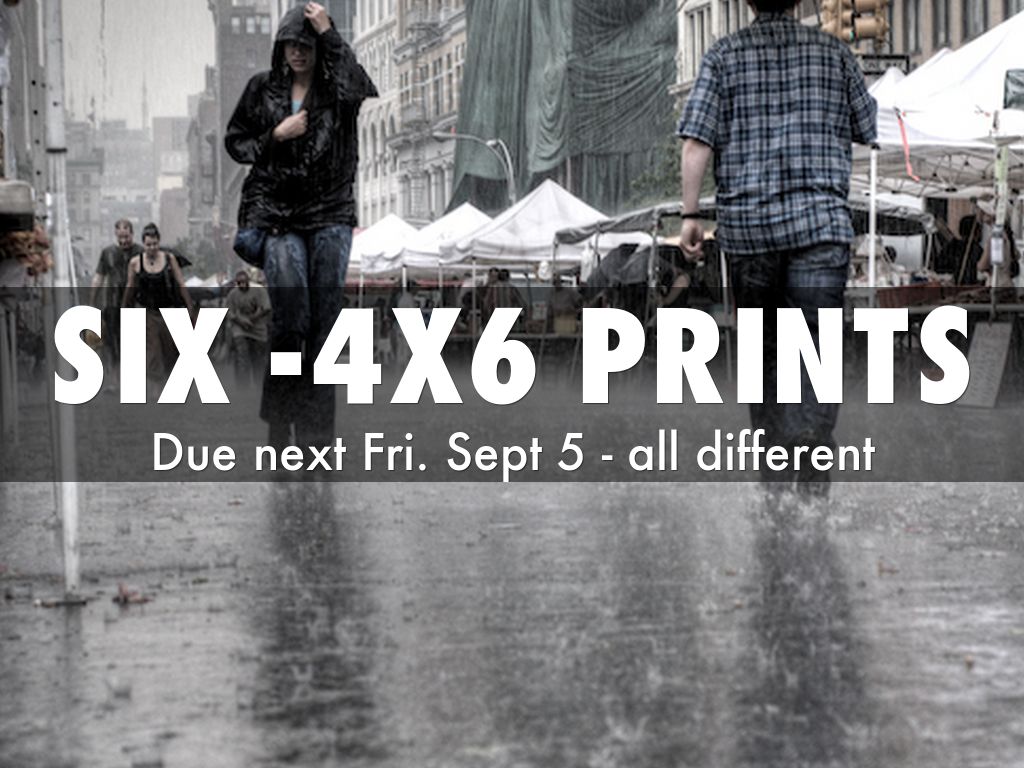First assignment need six different shots. You will do out of class, and edit on wednesday and order prints so you have on Friday. I will pick up at Costco on Thursday Evening, you set up account and pay me.