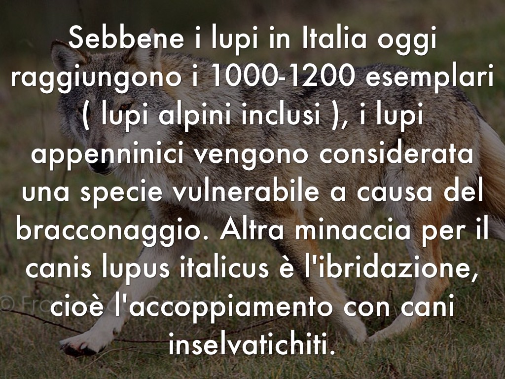 Sebbene i lupi in Italia oggi raggiungono i 1000-1200 esemplari ( lupi alpini inclusi ), i lupi appenninici vengono considerata una specie vulnerabile a causa del bracconaggio. Altra minaccia per il canis lupus italicus è l'ibridazione, cioè l'accoppiamento con cani inselvatichiti.