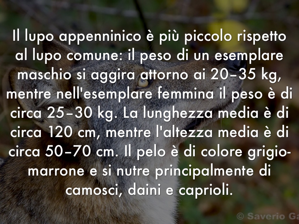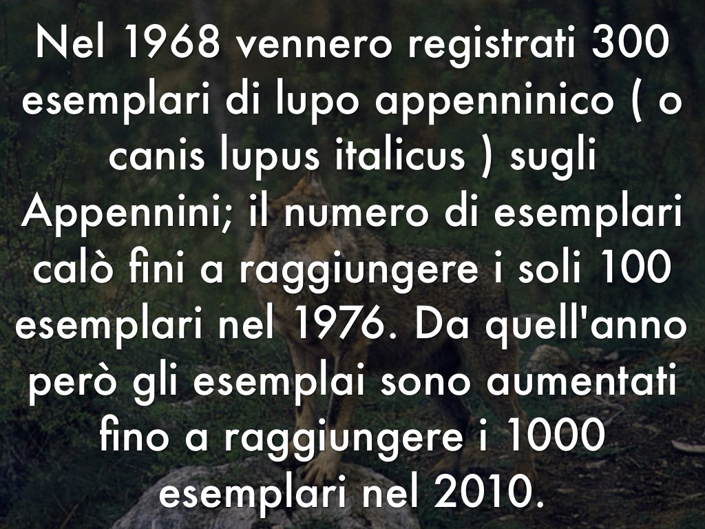 Nel 1968 vennero registrati 300 esemplari di lupo appenninico ( o canis lupus italicus ) sugli Appennini; il numero di esemplari calò fini a raggiungere i soli 100 esemplari nel 1976. Da quell'anno però gli esemplai sono aumentati fino a raggiungere i 1000 esemplari nel 2010.