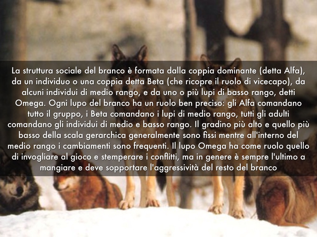 La struttura sociale del branco è formata dalla coppia dominante (detta Alfa), da un individuo o una coppia detta Beta (che ricopre il ruolo di vicecapo), da alcuni individui di medio rango, e da uno o più lupi di basso rango, detti Omega. Ogni lupo del branco ha un ruolo ben preciso: gli Alfa comandano tutto il gruppo, i Beta comandano i lupi di medio rango, tutti gli adulti comandano gli individui di medio e basso rango. Il gradino più alto e quello più basso della scala gerarchica generalmente sono fissi mentre all'interno del medio rango i cambiamenti sono frequenti. Il lupo Omega ha come ruolo quello di invogliare al gioco e stemperare i conflitti, ma in genere è sempre l'ultimo a mangiare e deve sopportare l'aggressività del resto del branco