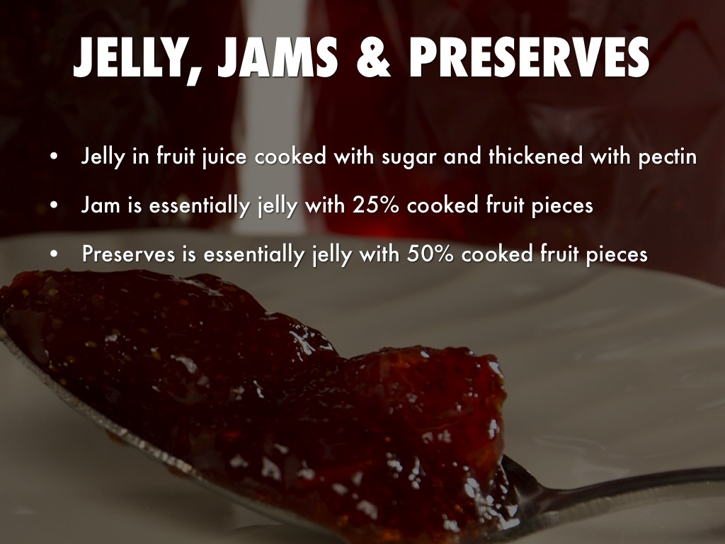 • Preserves is essentially jelly with 50% cooked fruit pieces