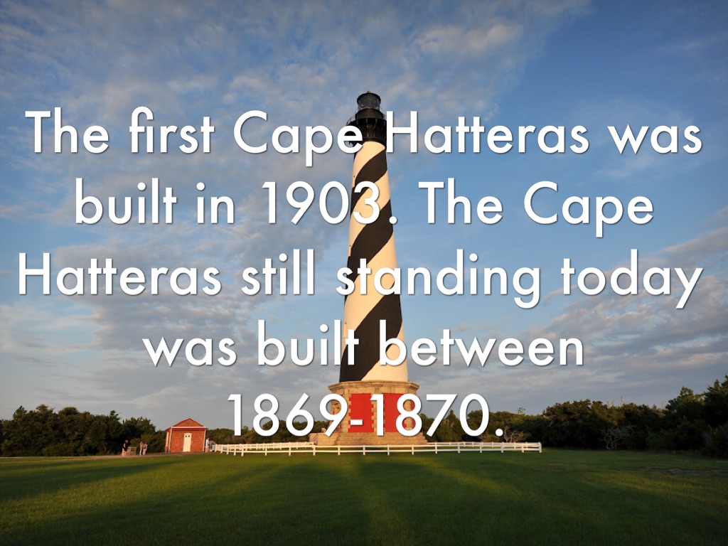 The first Cape Hatteras was built in 1903. The Cape Hatteras still standing today was built between 1869-1870.