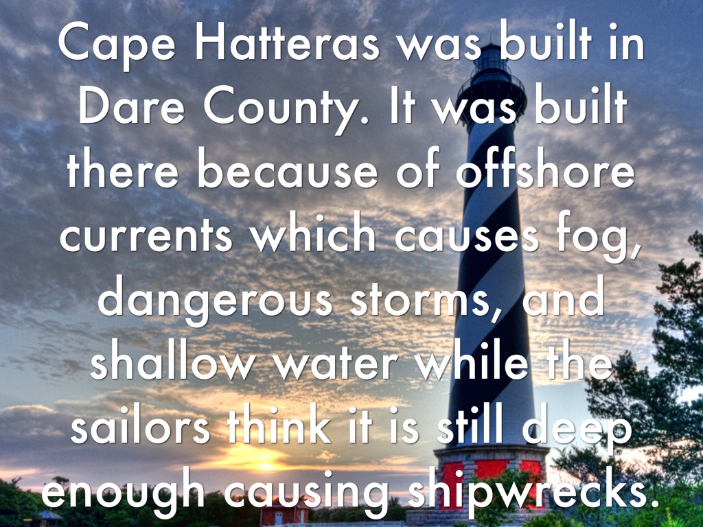 Cape Hatteras was built in Dare County. It was built there because of offshore currents which causes fog, dangerous storms, and shallow water while the sailors think it is still deep enough causing shipwrecks.