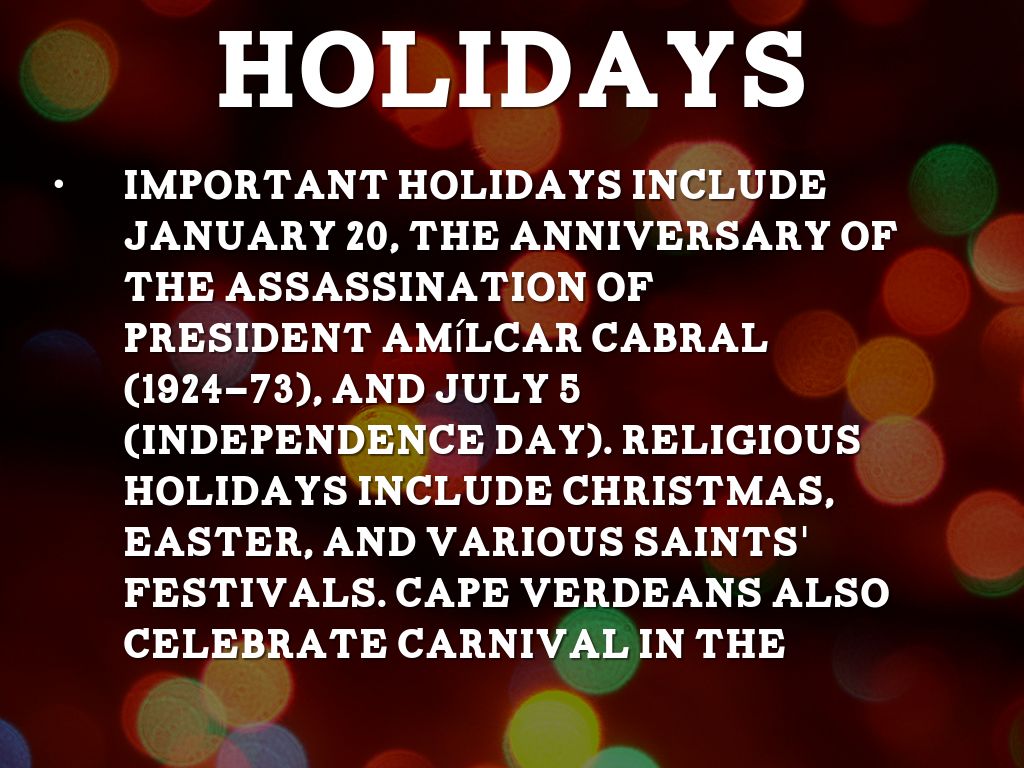 Important holidays include January 20, the anniversary of the assassination of President Amílcar Cabral (1924–73), and July 5 (Independence Day). Religious holidays include Christmas, Easter, and various saints' festivals. Cape Verdeans also celebrate Carnival in the days preceding Lent. The tabanka festival combines African-style shrines with a Portuguese religious parade.