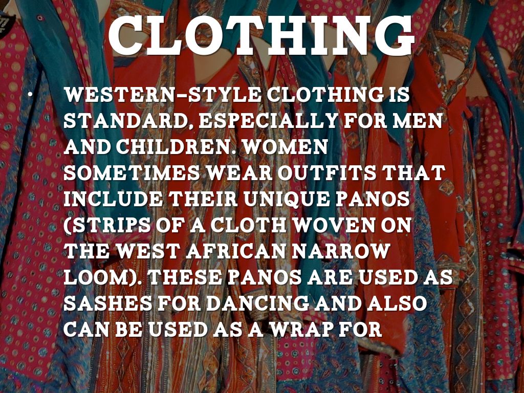 Western-style clothing is standard, especially for men and children. Women sometimes wear outfits that include their unique panos (strips of a cloth woven on the West African narrow loom). These panos are used as sashes for dancing and also can be used as a wrap for carrying babies. Used clothing from Europe and the United States is also used to meet local needs.