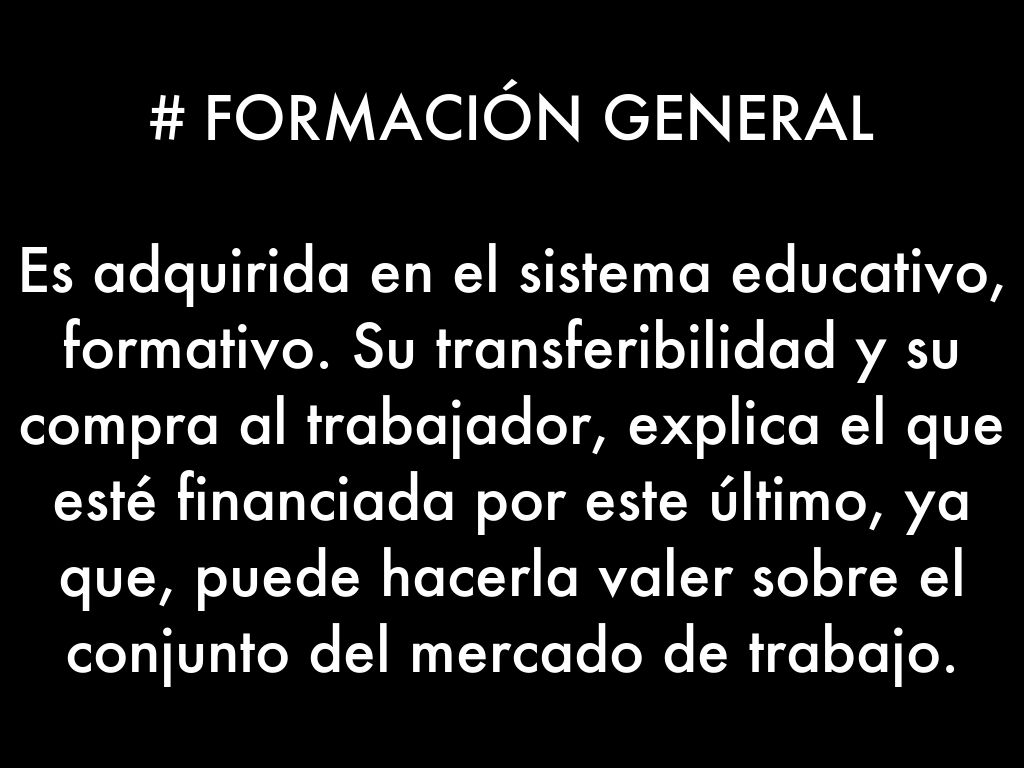Es adquirida en el sistema educativo, formativo. Su transferibilidad y su compra al trabajador, explica el que esté financiada por este último, ya que, puede hacerla valer sobre el conjunto del mercado de trabajo.