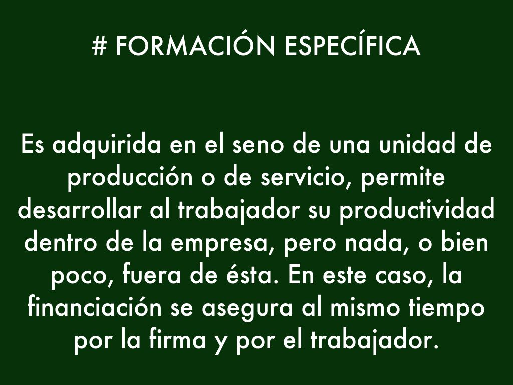 Es adquirida en el seno de una unidad de producción o de servicio, permite desarrollar al trabajador su productividad dentro de la empresa, pero nada, o bien poco, fuera de ésta. En este caso, la financiación se asegura al mismo tiempo por la firma y por el trabajador.