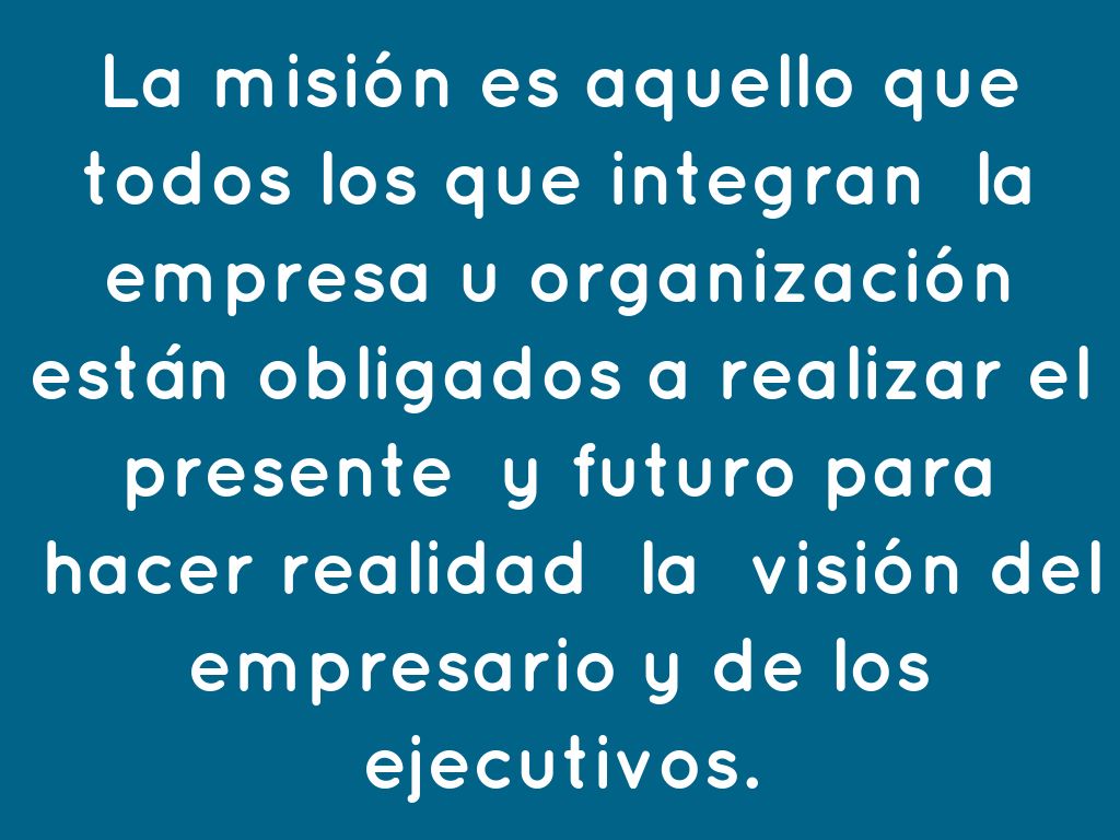 La misión es aquello que todos los que integran la empresa u organización están obligados a realizar el presente y futuro para hacer realidad la visión del empresario y de los ejecutivos.