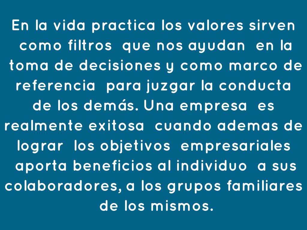En la vida practica los valores sirven como filtros que nos ayudan en la toma de decisiones y como marco de referencia para juzgar la conducta de los demás. Una empresa es realmente exitosa cuando ademas de lograr los objetivos empresariales aporta beneficios al individuo a sus colaboradores, a los grupos familiares de los mismos.