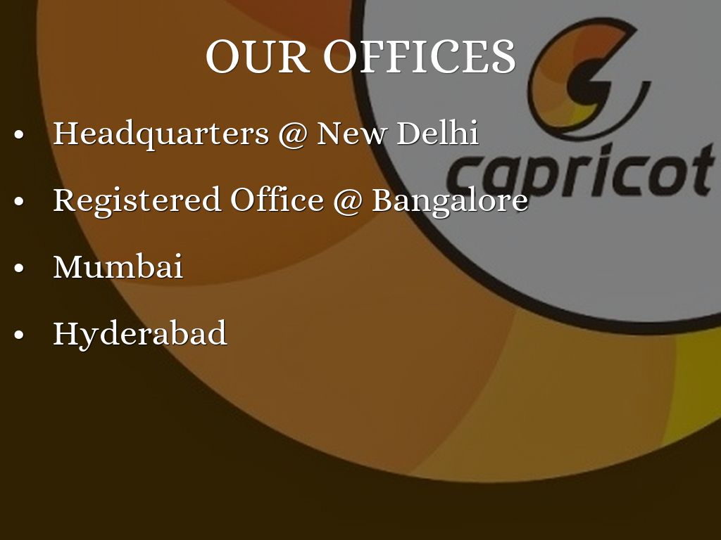 Capricot Technologies Pvt. Ltd have its registered office at Bengaluru and Head Quarter at Delhi. Operational Presence across the country, with current offices at Delhi, Jaipur, Mohali / Chandigarh, Lucknow, Mumbai, Belgaum, Bangalore, Mangalore, Kochin, Hyderabad.