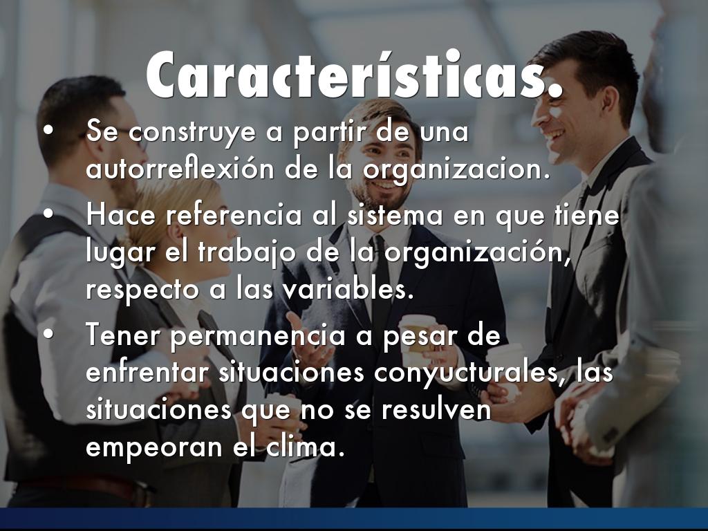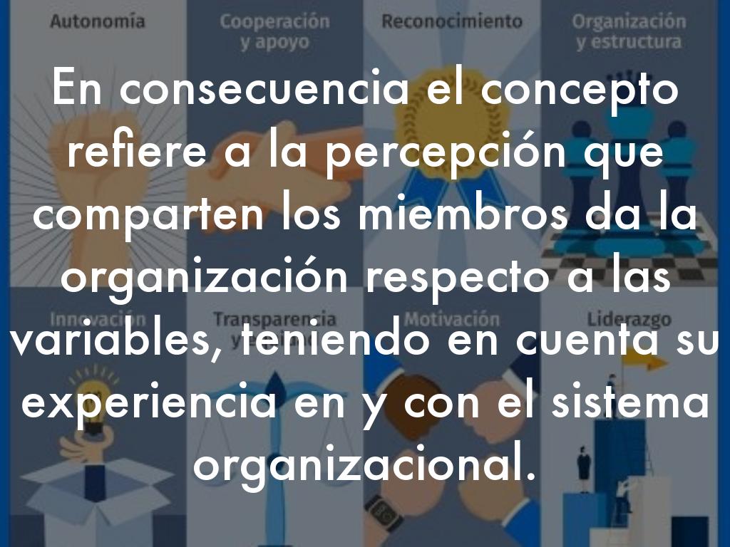 En consecuencia el concepto refiere a la percepción que comparten los miembros da la organización respecto a las variables, teniendo en cuenta su experiencia en y con el sistema organizacional.