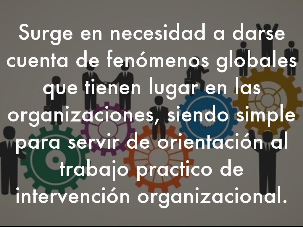 Surge en necesidad a darse cuenta de fenómenos globales que tienen lugar en las organizaciones, siendo simple para servir de orientación al trabajo practico de intervención organizacional.