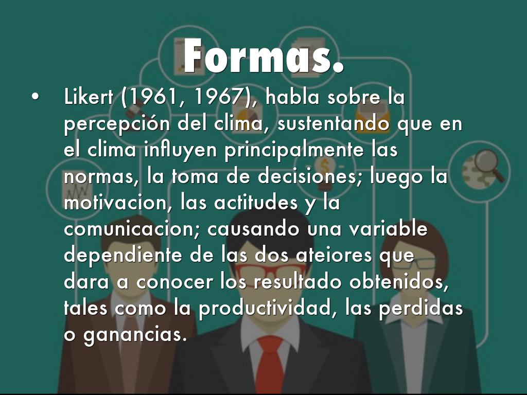 - Likert (1961, 1967), habla sobre la percepción del clima, sustentando que en el clima influyen principalmente las normas, la toma de decisiones; luego la motivacion, las actitudes y la comunicacion; causando una variable dependiente de las dos ateiores que dara a conocer los resultado obtenidos, tales como la productividad, las perdidas o ganancias.