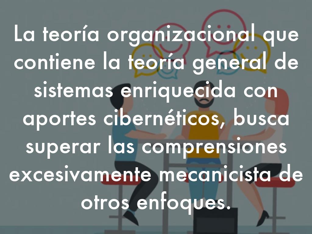 La teoría organizacional que contiene la teoría general de sistemas enriquecida con aportes cibernéticos, busca superar las comprensiones excesivamente mecanicista de otros enfoques.