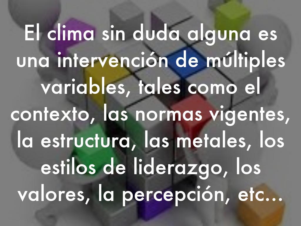 El clima sin duda alguna es una intervención de múltiples variables, tales como el contexto, las normas vigentes, la estructura, las metales, los estilos de liderazgo, los valores, la percepción, etc...