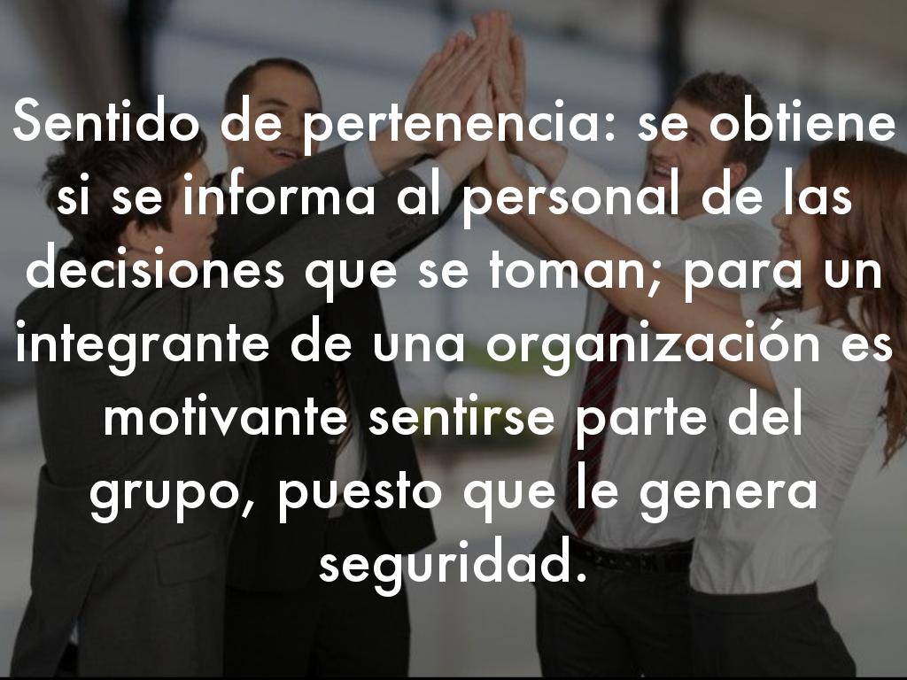 Sentido de pertenencia: se obtiene si se informa al personal de las decisiones que se toman; para un integrante de una organización es motivante sentirse parte del grupo, puesto que le genera seguridad.