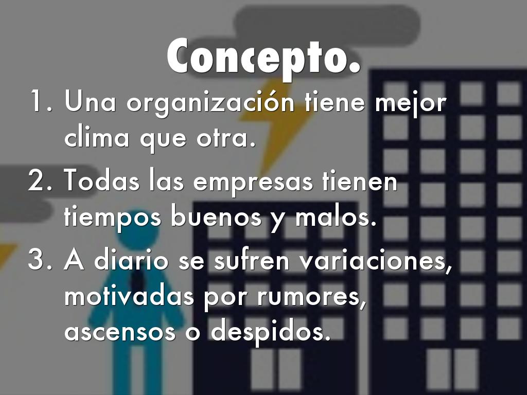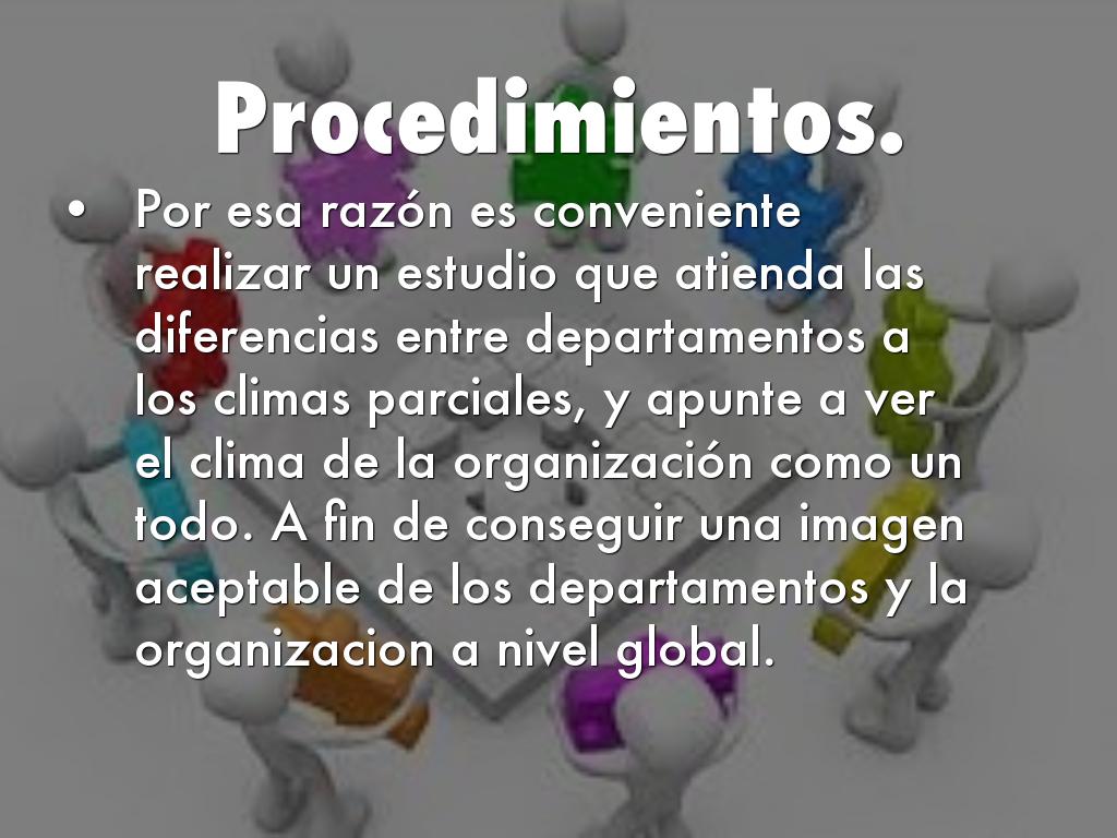 - Por esa razón es conveniente realizar un estudio que atienda las diferencias entre departamentos a los climas parciales, y apunte a ver el clima de la organización como un todo. A fin de conseguir una imagen aceptable de los departamentos y la organizacion a nivel global.