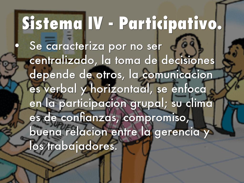 - Se caracteriza por no ser centralizado, la toma de decisiones depende de otros, la comunicacion es verbal y horizontaal, se enfoca en la participacion grupal; su clima es de confianzas, compromiso, buena relacion entre la gerencia y los trabajadores.