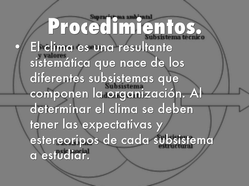 - El clima es una resultante sistemática que nace de los diferentes subsistemas que componen la organización. Al determinar el clima se deben tener las expectativas y estereoripos de cada subsistema a estudiar.