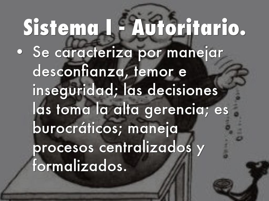- Se caracteriza por manejar desconfianza, temor e inseguridad; las decisiones las toma la alta gerencia; es burocráticos; maneja procesos centralizados y formalizados.