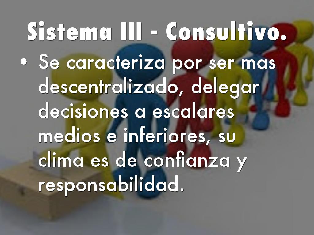 - Se caracteriza por ser mas descentralizado, delegar decisiones a escalares medios e inferiores, su clima es de confianza y responsabilidad.