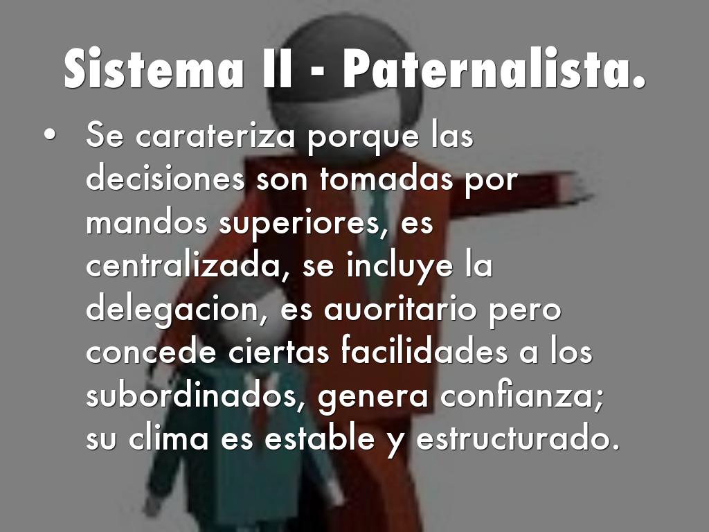 - Se carateriza porque las decisiones son tomadas por mandos superiores, es centralizada, se incluye la delegacion, es auoritario pero concede ciertas facilidades a los subordinados, genera confianza; su clima es estable y estructurado.