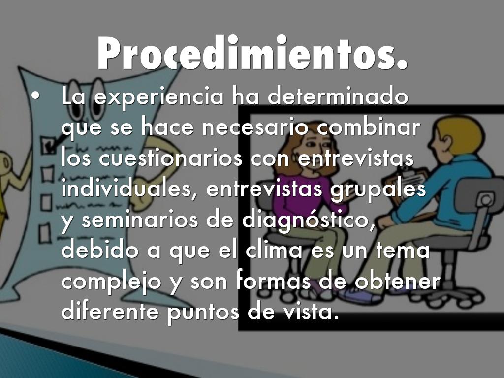 - La experiencia ha determinado que se hace necesario combinar los cuestionarios con entrevistas individuales, entrevistas grupales y seminarios de diagnóstico, debido a que el clima es un tema complejo y son formas de obtener diferente puntos de vista.