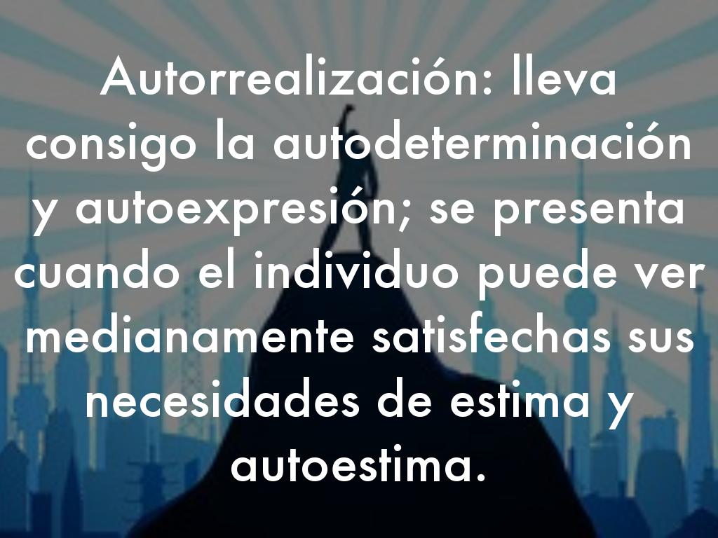 Autorrealización: lleva consigo la autodeterminación y autoexpresión; se presenta cuando el individuo puede ver medianamente satisfechas sus necesidades de estima y autoestima.
