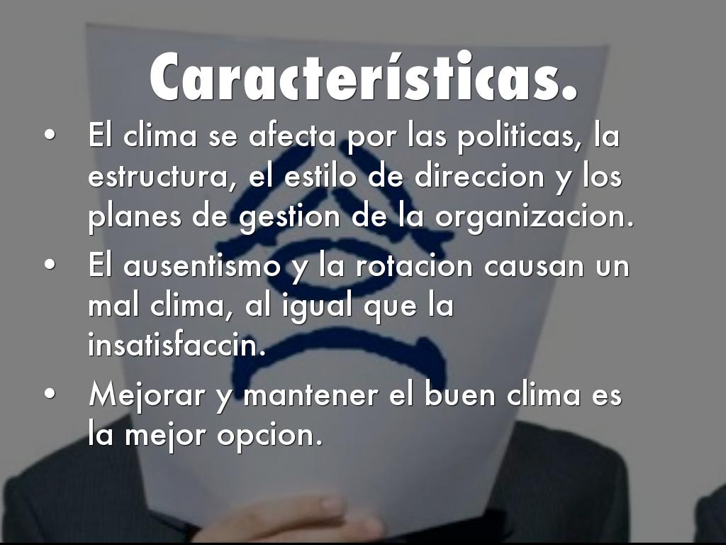 - El clima se afecta por las politicas, la estructura, el estilo de direccion y los planes de gestion de la organizacion.