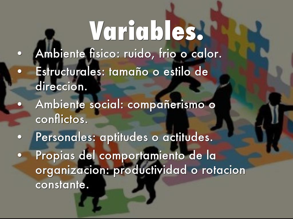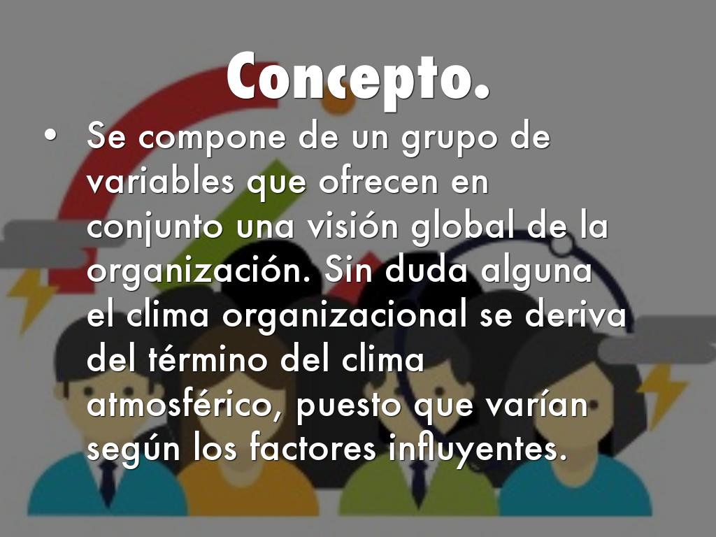 - Se compone de un grupo de variables que ofrecen en conjunto una visión global de la organización. Sin duda alguna el clima organizacional se deriva del término del clima atmosférico, puesto que varían según los factores influyentes.