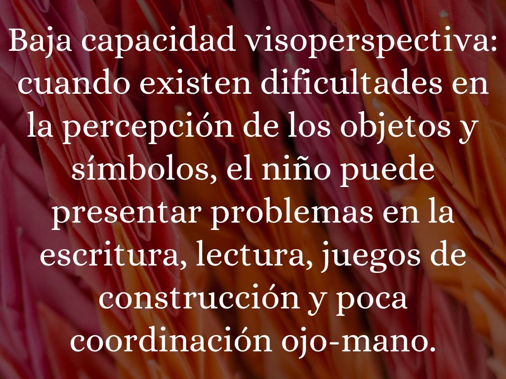 Baja capacidad visoperspectiva: cuando existen dificultades en la percepción de los objetos y símbolos, el niño puede presentar problemas en la escritura, lectura, juegos de construcción y poca coordinación ojo-mano.