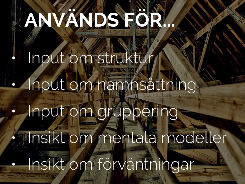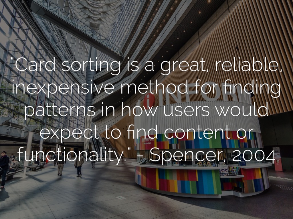 "Card sorting is a great, reliable, inexpensive method for finding patterns in how users would expect to find content or functionality." - Spencer, 2004