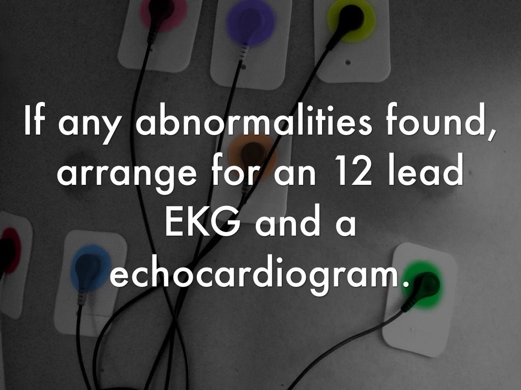 If any abnormalities found, arrange for an 12 lead EKG and a echocardiogram.