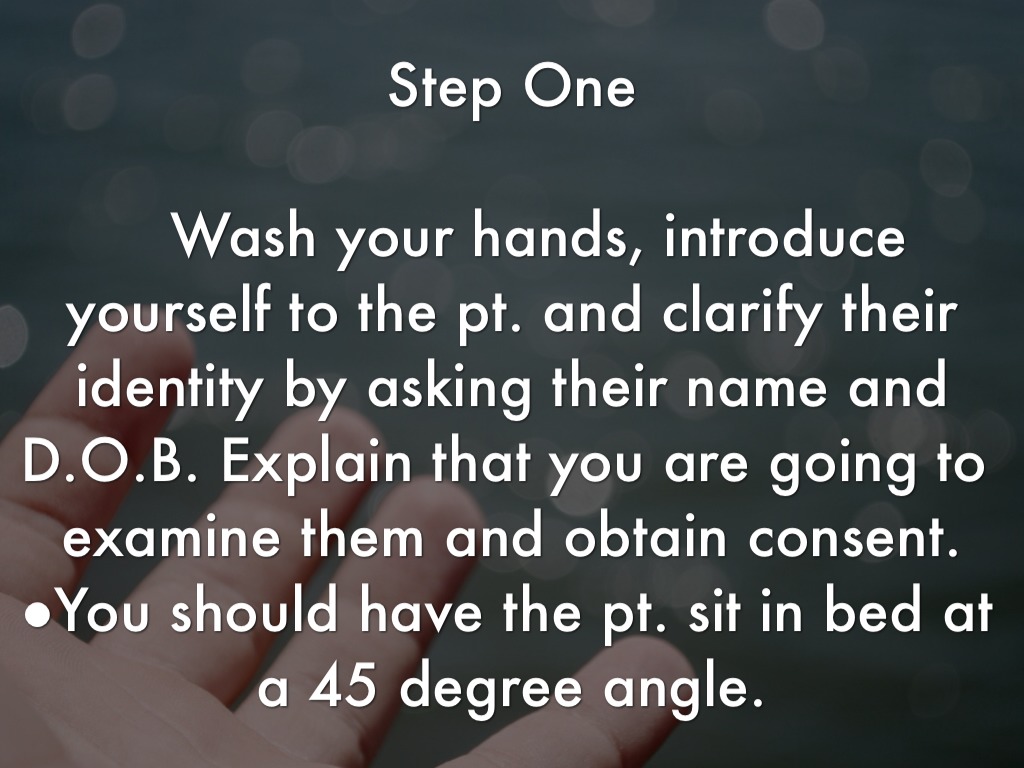 Wash your hands, introduce yourself to the pt. and clarify their identity by asking their name and D.O.B. Explain that you are going to examine them and obtain consent.
