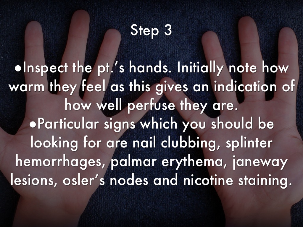 ●Inspect the pt.’s hands. Initially note how warm they feel as this gives an indication of how well perfuse they are.