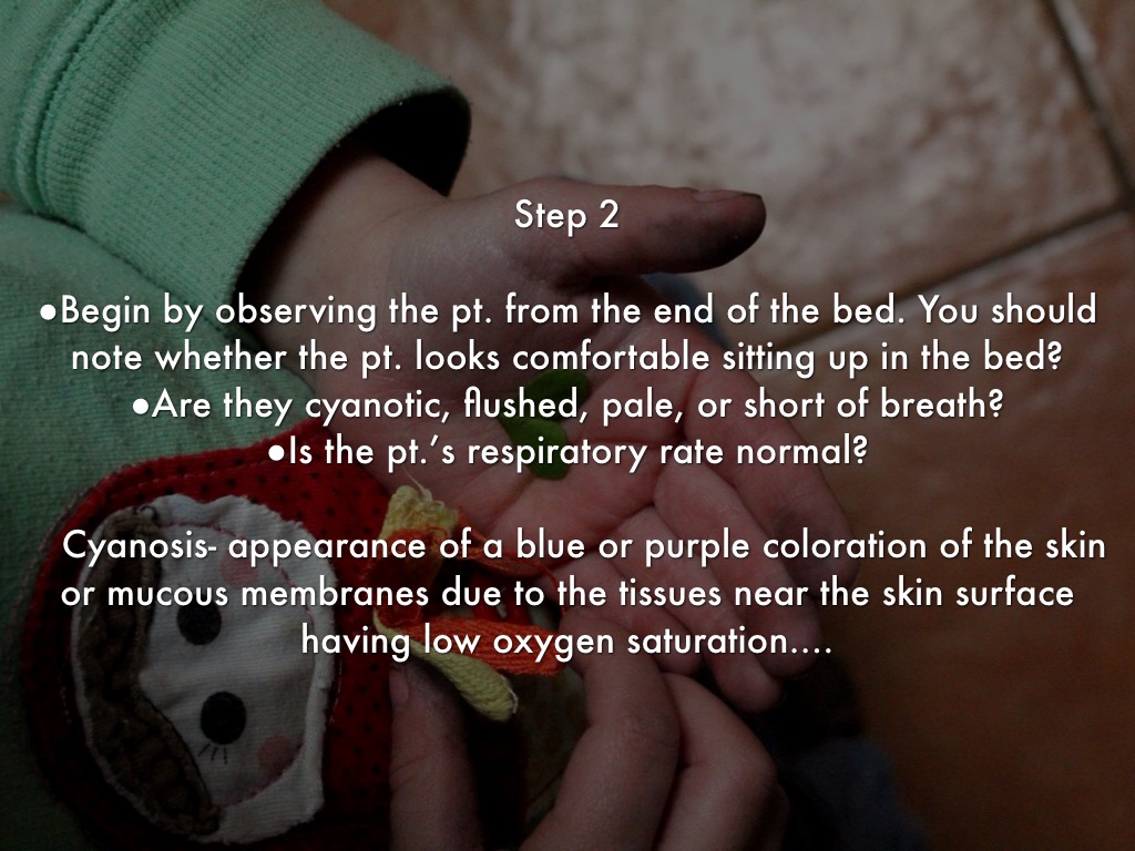●Begin by observing the pt. from the end of the bed. You should note whether the pt. looks comfortable sitting up in the bed?