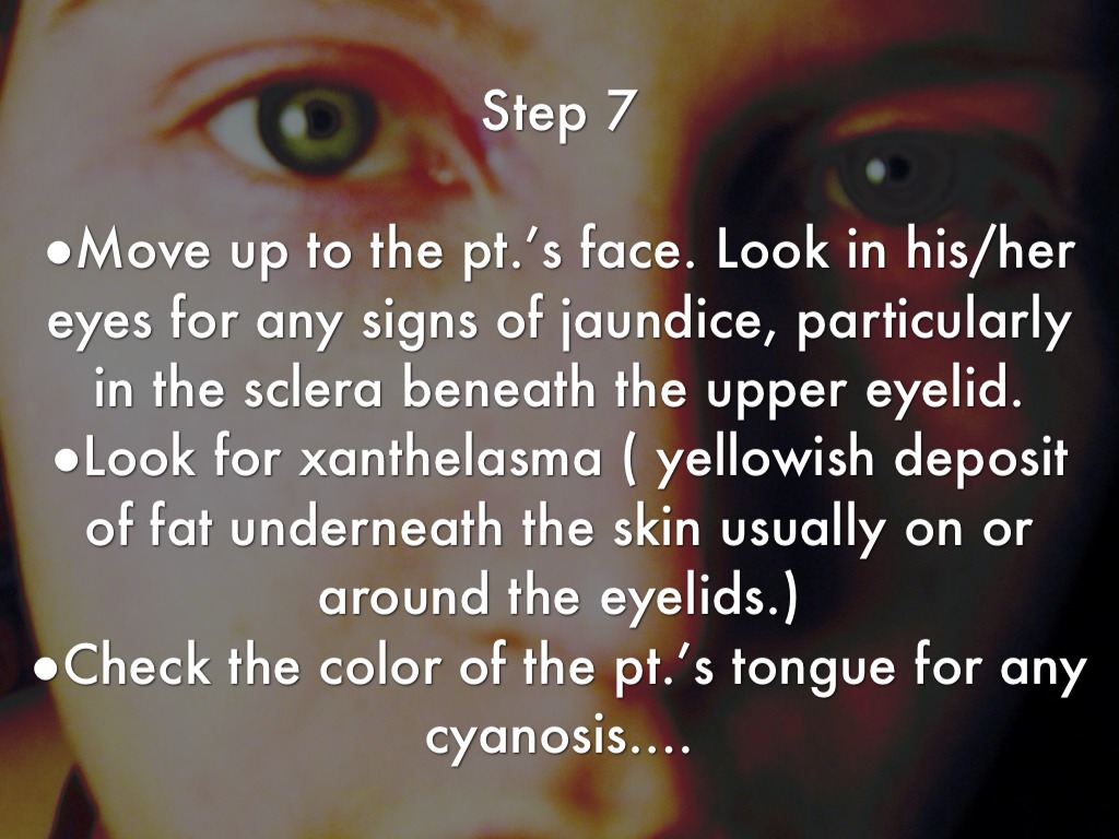 ●Move up to the pt.’s face. Look in his/her eyes for any signs of jaundice, particularly in the sclera beneath the upper eyelid.