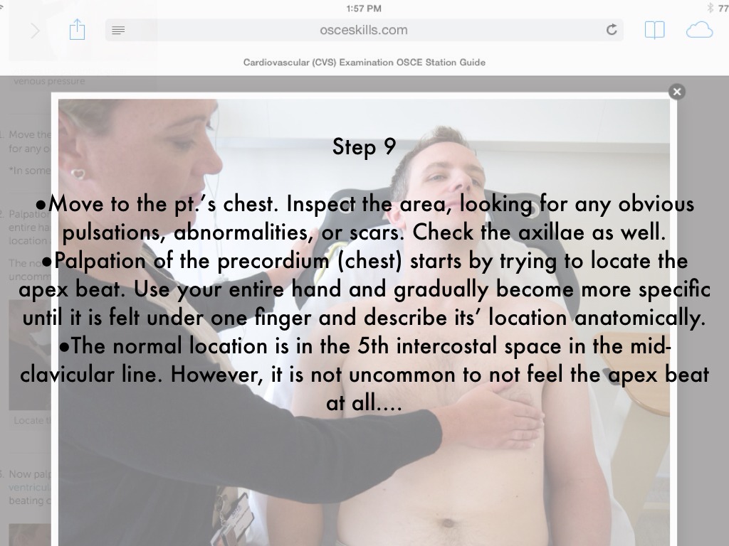 ●Palpation of the precordium (chest) starts by trying to locate the apex beat. Use your entire hand and gradually become more specific until it is felt under one finger and describe its’ location anatomically.