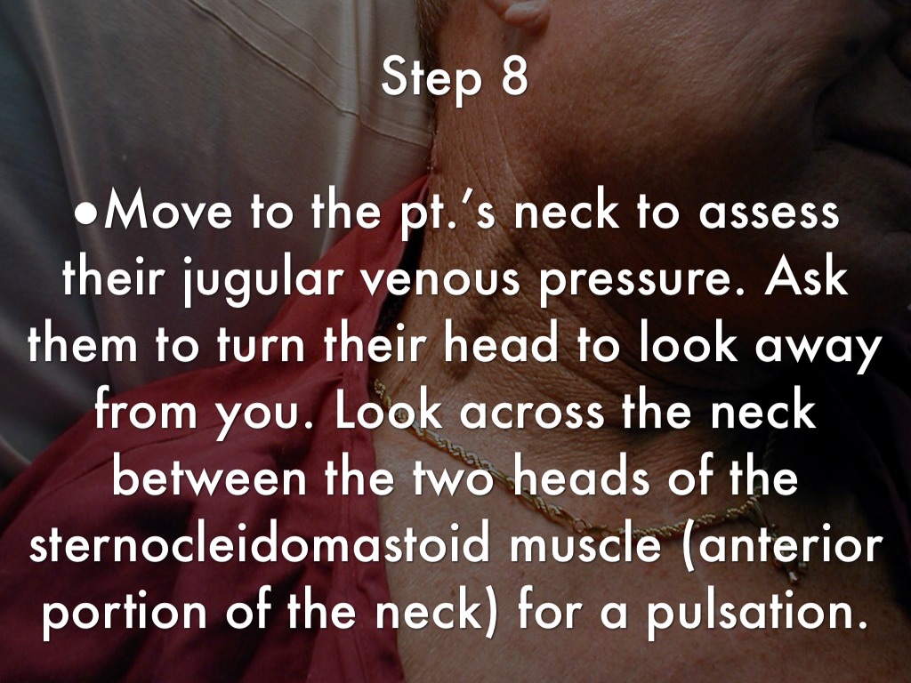 ●Move to the pt.’s neck to assess their jugular venous pressure. Ask them to turn their head to look away from you. Look across the neck between the two heads of the sternocleidomastoid muscle (anterior portion of the neck) for a pulsation.