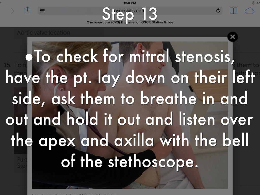 ●To check for mitral stenosis, have the pt. lay down on their left side, ask them to breathe in and out and hold it out and listen over the apex and axilla with the bell of the stethoscope.