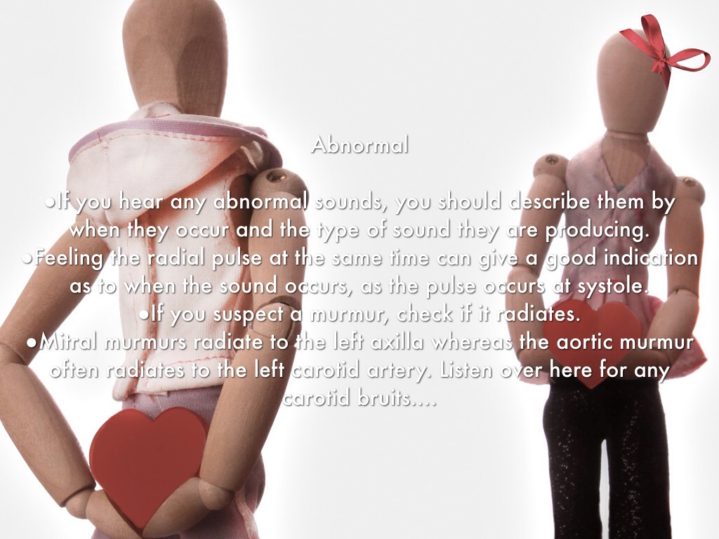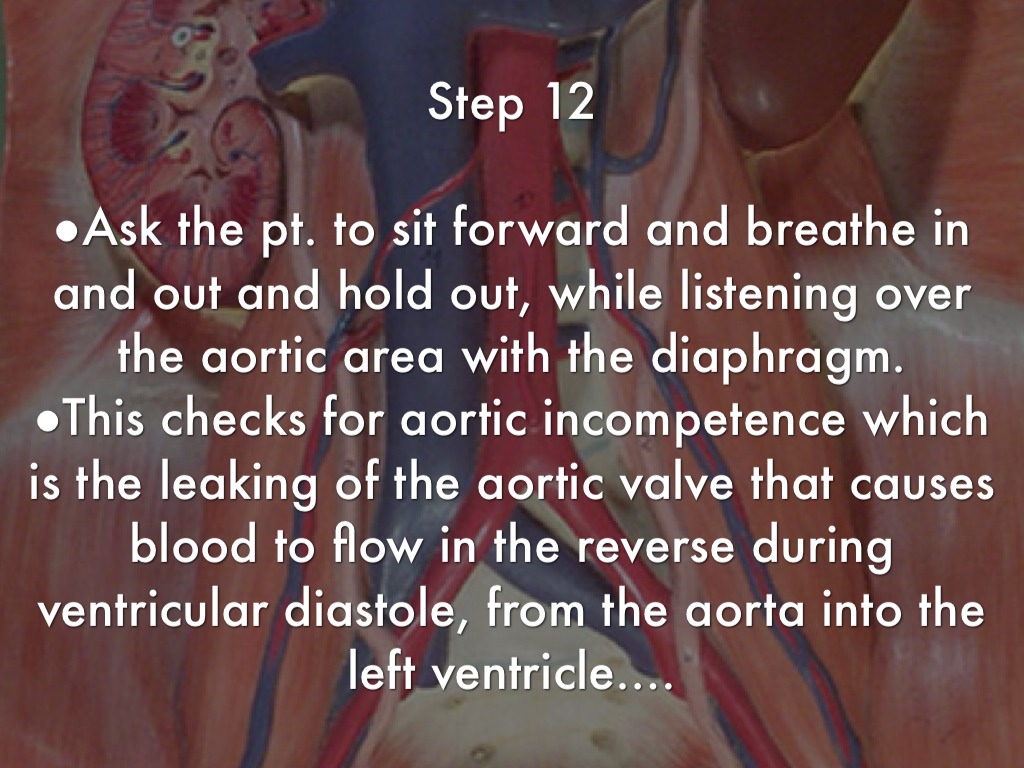 ●Ask the pt. to sit forward and breathe in and out and hold out, while listening over the aortic area with the diaphragm.