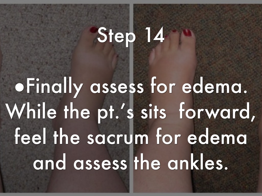 ●Finally assess for edema. While the pt.’s sits forward, feel the sacrum for edema and assess the ankles.
