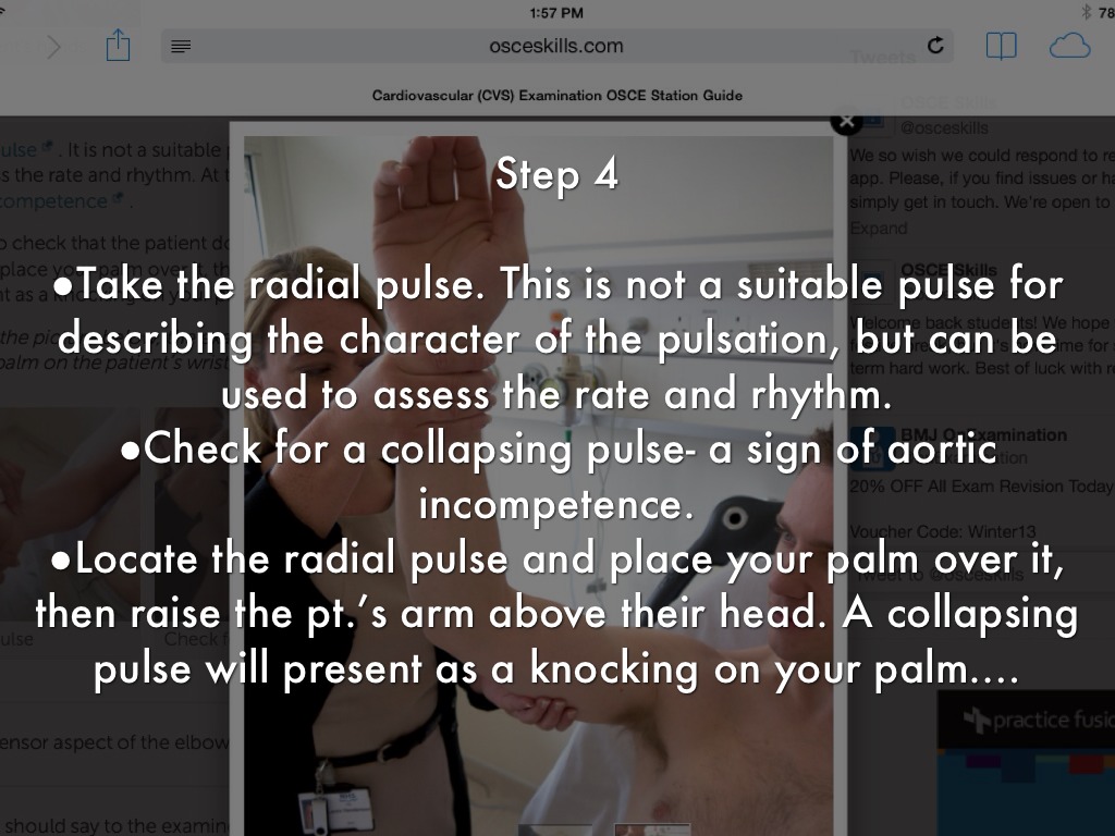 ●Locate the radial pulse and place your palm over it, then raise the pt.’s arm above their head. A collapsing pulse will present as a knocking on your palm.