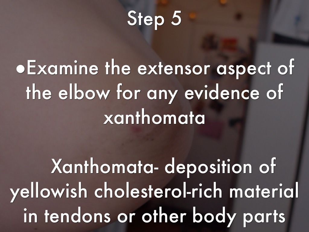 ●Examine the extensor aspect of the elbow for any evidence of xanthomata