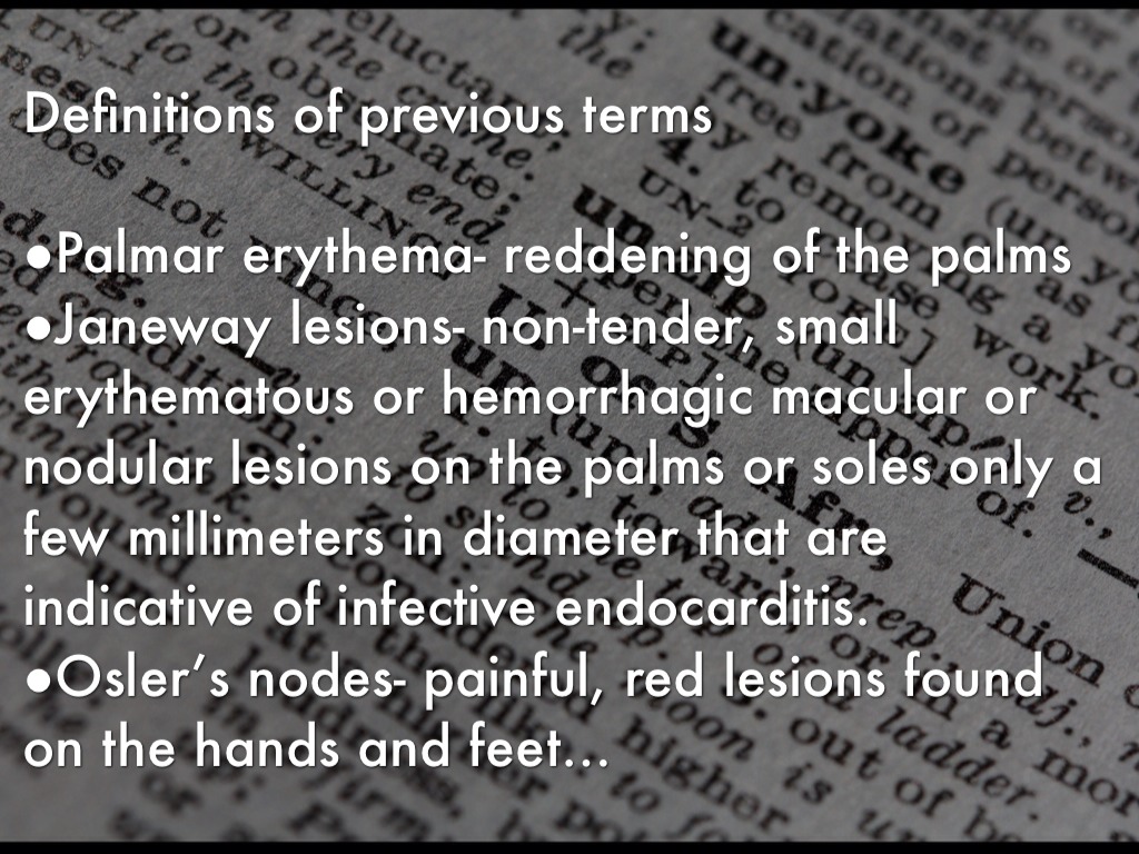 ●Janeway lesions- non-tender, small erythematous or hemorrhagic macular or nodular lesions on the palms or soles only a few millimeters in diameter that are indicative of infective endocarditis.