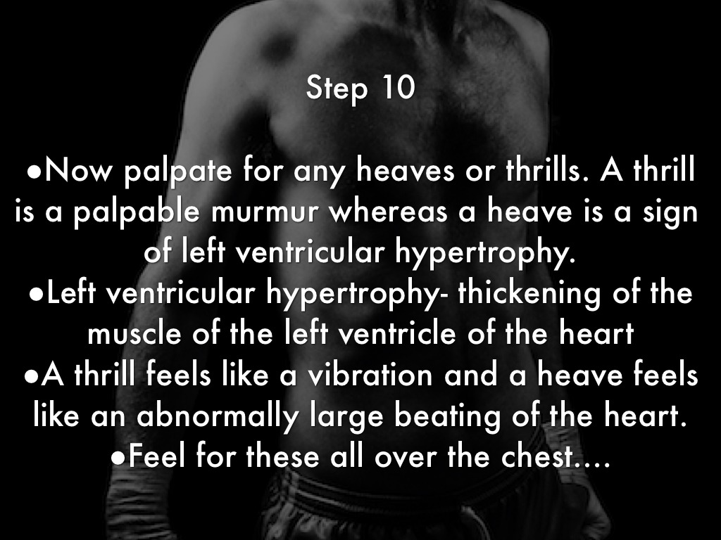 ●Now palpate for any heaves or thrills. A thrill is a palpable murmur whereas a heave is a sign of left ventricular hypertrophy.
