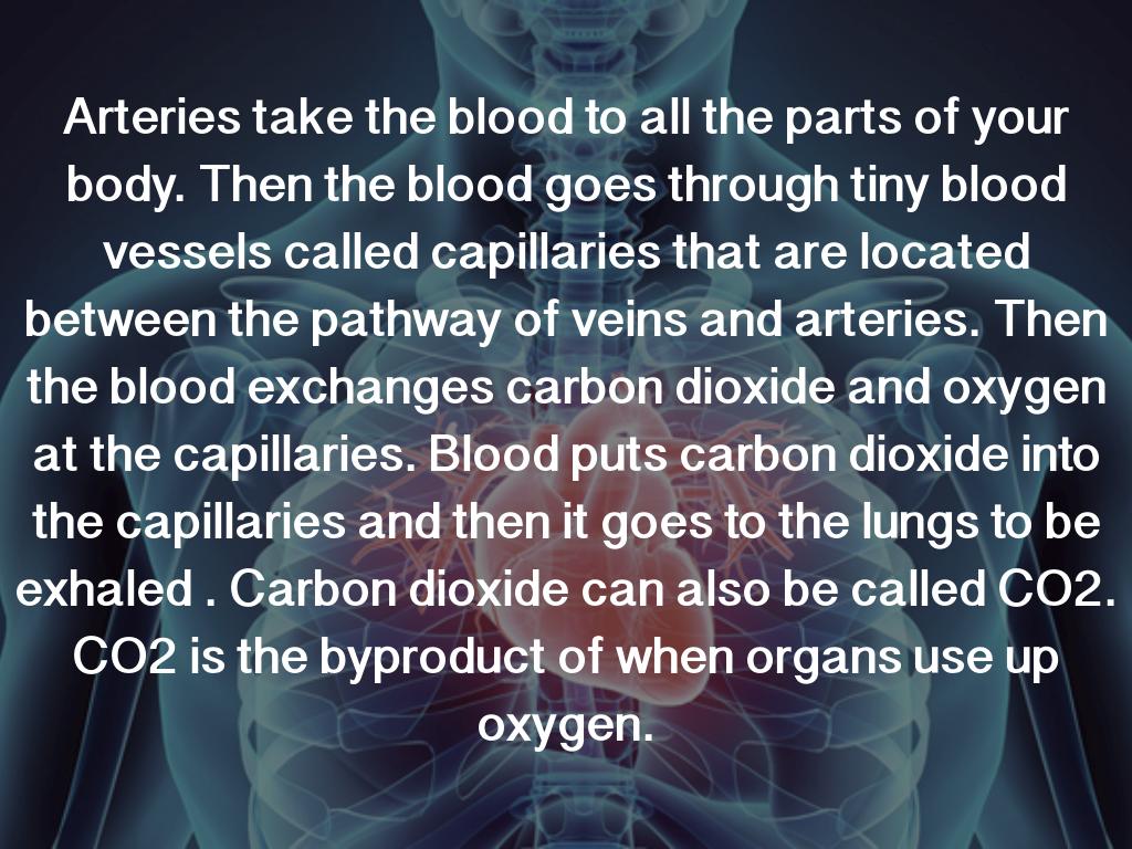 Arteries take the blood to all the parts of your body. Then the blood goes through tiny blood vessels called capillaries that are located between the pathway of veins and arteries. Then the blood exchanges carbon dioxide and oxygen at the capillaries. Blood puts carbon dioxide into the capillaries and then it goes to the lungs to be exhaled . Carbon dioxide can also be called CO2. CO2 is the byproduct of when organs use up oxygen.